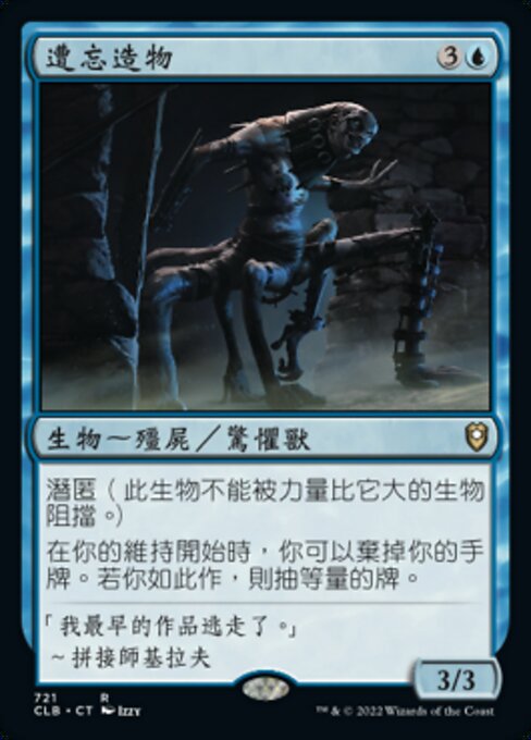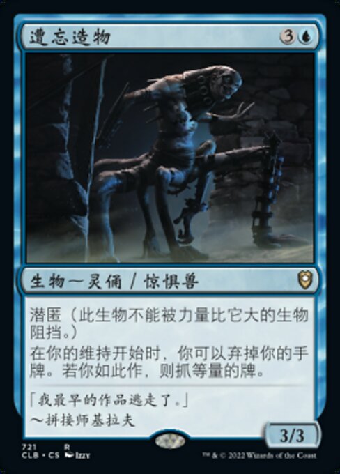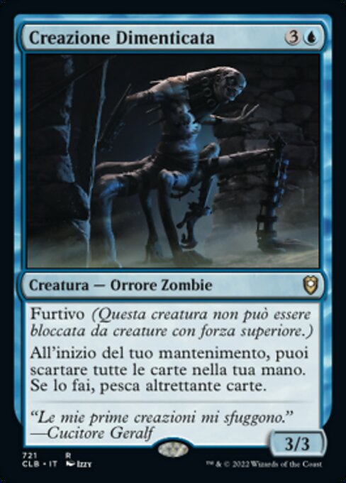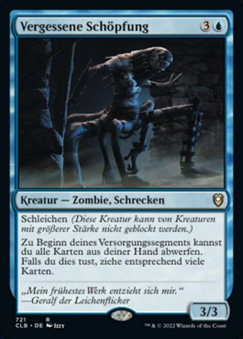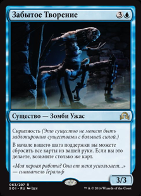 |  Variations— Parts— | Забытое Творение3 / 3 Скрытность (Это существо не может быть заблокировано существами с большей силой.) В начале вашего шага поддержки вы можете сбросить все карты из вашей руки. Если вы это делаете, возьмите столько же карт.