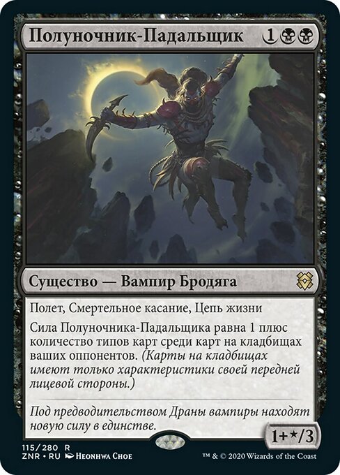 ![]() Variations— Parts— | Полуночник-Падальщик1+* / 3 Полет, Смертельное касание, Цепь жизни Сила Полуночника-Падальщика равна 1 плюс количество типов карт среди карт на кладбищах ваших оппонентов.