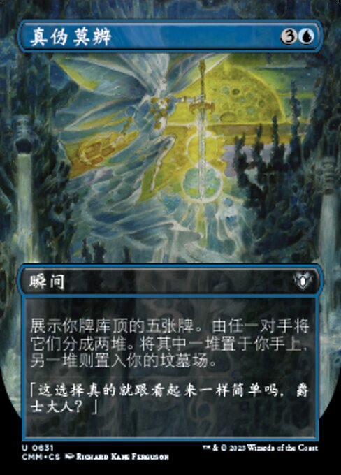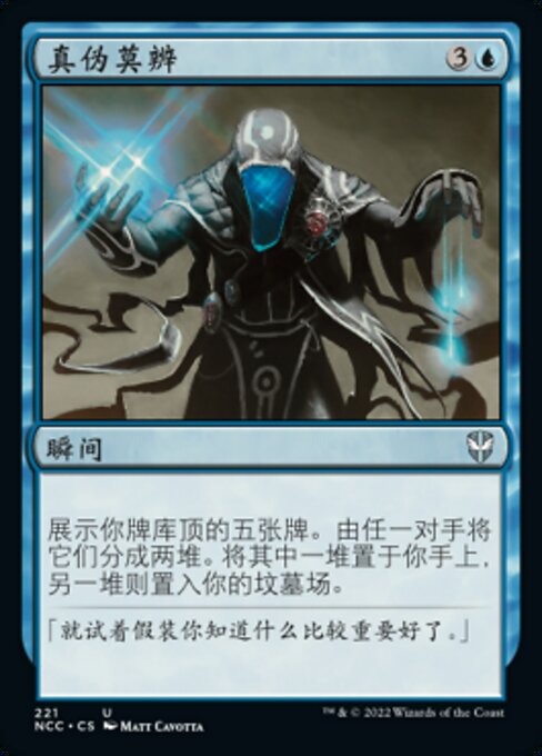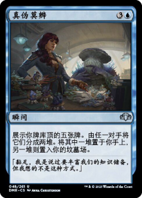 |  Variations— Parts— | 真伪莫辨展示你牌库顶的五张牌。由任一对手将它们分成两堆。将其中一堆置于你手上,另一堆则置入你的坟墓场。
