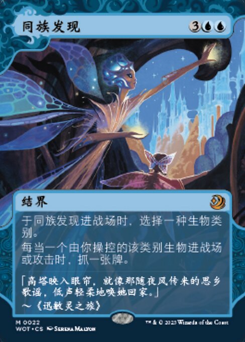 ![]() Variations— Parts— | 同族发现于同族发现进战场时,选择一种生物类别。 每当一个由你操控的该类别生物进战场或攻击时,抓一张牌。