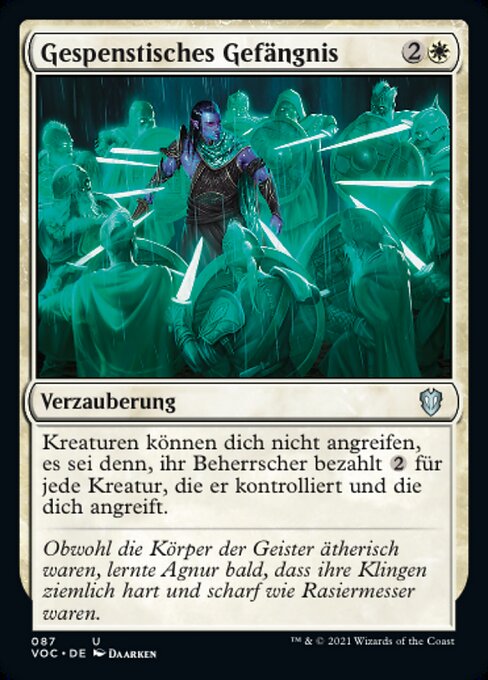 |  Variations— Parts— | Gespenstisches GefängnisKreaturen können dich nicht angreifen, falls ihr Beherrscher nicht für jede dich angreifende Kreatur, die er kontrolliert,