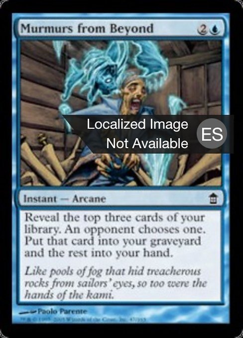 ![]() Variations— Parts— | Murmullos del más alláMuestra las tres primeras cartas de tu biblioteca. Un oponente elige una de ellas. Pon esa carta en tu cementerio y el resto en tu mano.