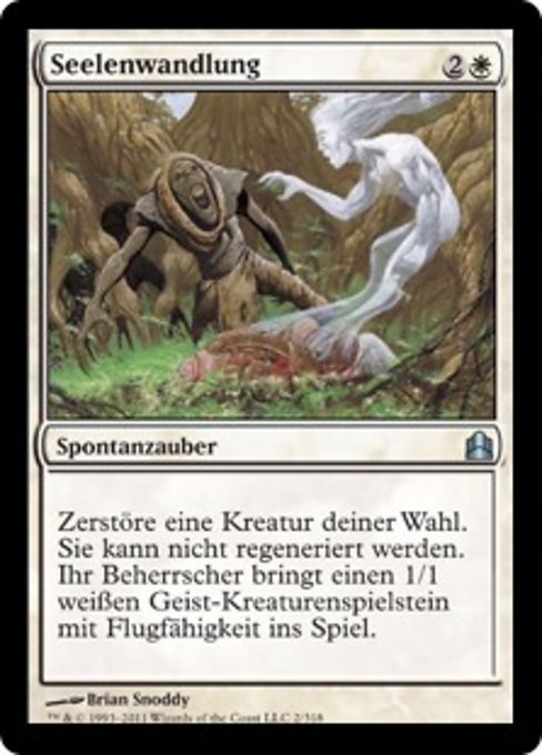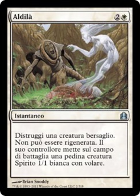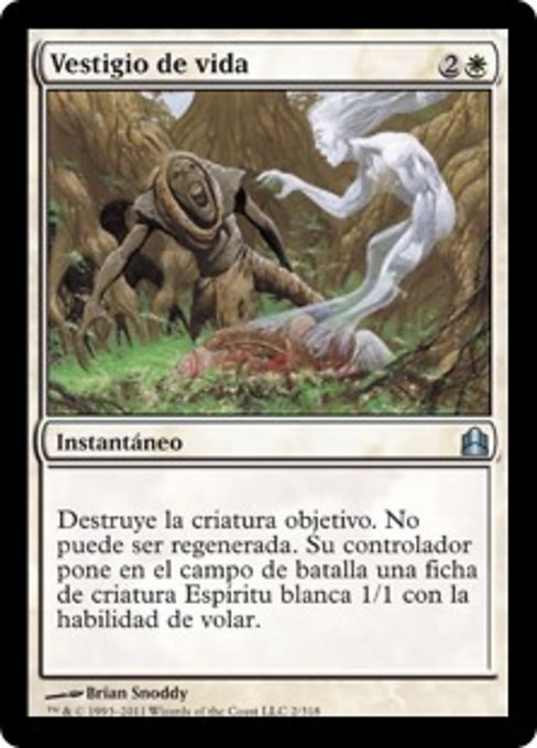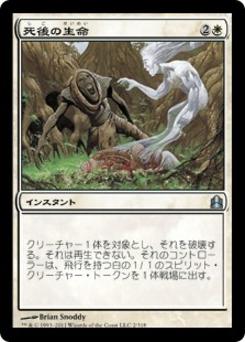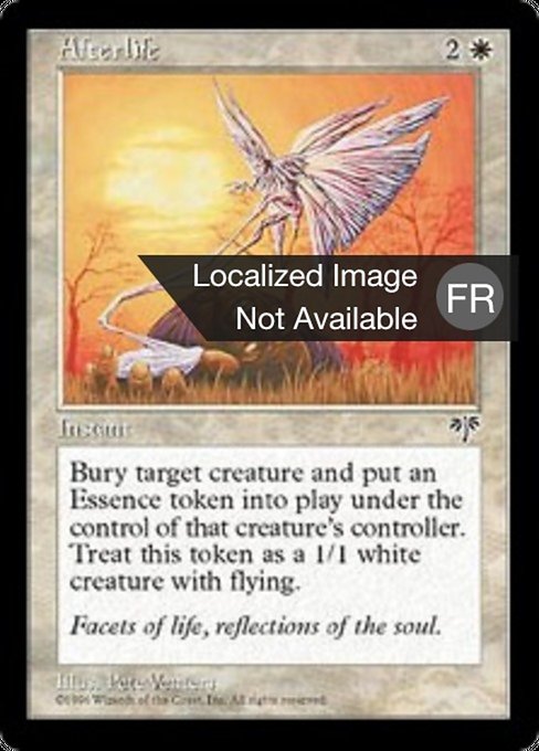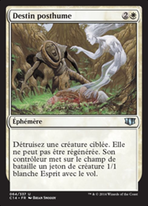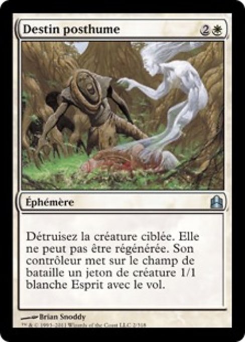![]() Variations— Parts— | Destin posthumeDétruisez la créature ciblée. Elle ne peut pas être régénérée. Son contrôleur met sur le champ de bataille un jeton de créature 1/1 blanche Esprit avec le vol.