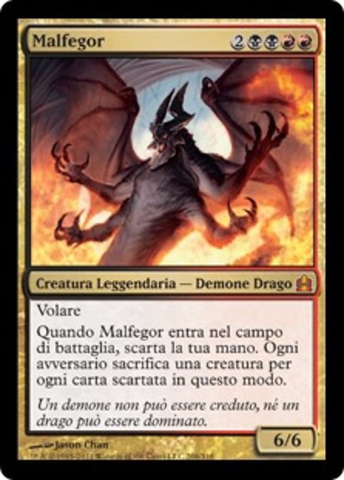 |  Variations— Parts— | Malfégor6 / 6 Vol Quand Malfégor arrive sur le champ de bataille, défaussez-vous de votre main. Chaque adversaire sacrifie une créature pour chaque carte défaussée de cette manière.