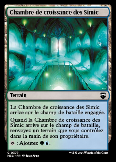 |  Variations— Parts— | Chambre de croissance des SimicLa Chambre de croissance des Simic arrive sur le champ de bataille engagée. Quand la Chambre de croissance des Simic arrive sur le champ de bataille, renvoyez un terrain que vous contrôlez dans la main de son propriétaire.