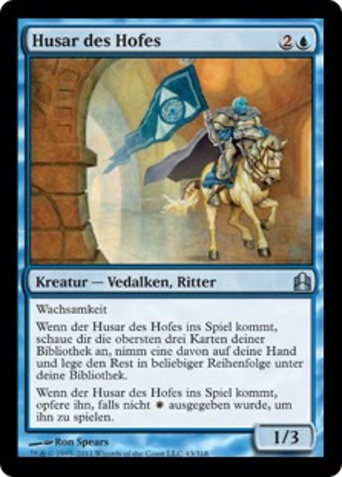 |  Variations— Parts— | Hussard de la cour1 / 3 Vigilance Quand le Hussard de la cour arrive sur le champ de bataille, regardez les trois cartes du dessus de votre bibliothèque, puis mettez l'une d'entre elles dans votre main et le reste au-dessous de votre bibliothèque, dans n'importe quel ordre. Quand le Hussard de la cour arrive sur le champ de bataille, sacrifiez-le à moins que