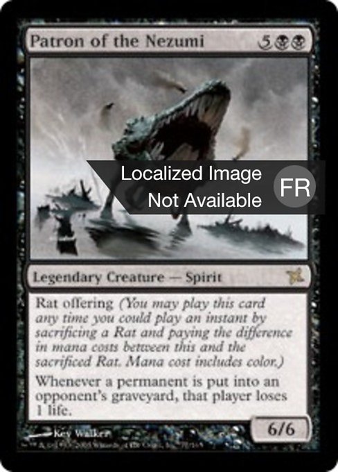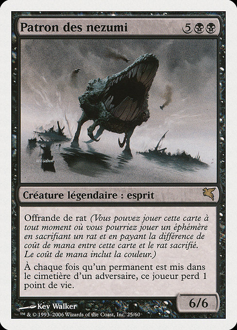 ![]() Variations— Parts— | Patron des nezumi6 / 6 Offrande de rat (Vous pouvez lancer cette carte à tout moment où vous pourriez lancer un éphémère en sacrifiant un rat et en payant la différence de coût de mana entre cette carte et le rat sacrifié. Les coûts de mana incluent les couleurs.) À chaque fois qu'un permanent est mis dans le cimetière d'un adversaire, ce joueur perd 1 point de vie.