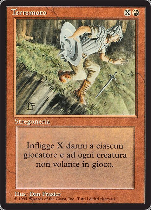 |  Variations— Parts— | TerremotoIl Terremoto infligge X danni a ogni creatura senza volare e a ogni giocatore.