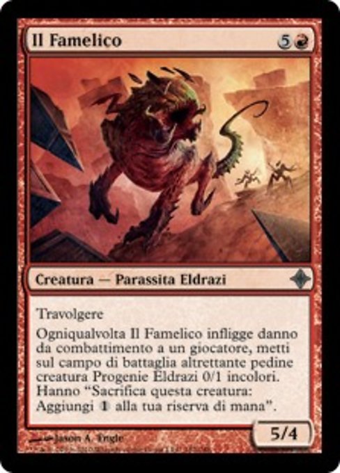 ![]() Variations— Parts— | Il Famelico5 / 4 Travolgere Ogniqualvolta Il Famelico infligge danno da combattimento a un giocatore, metti sul campo di battaglia altrettante pedine creatura Progenie Eldrazi 0/1 incolori. Hanno "Sacrifica questa creatura: Aggiungi