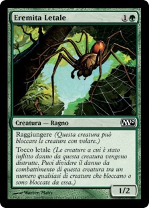 |  Variations— Parts— | Eremita Letale1 / 2 Raggiungere (Questa creatura può bloccare le creature con volare.) Tocco letale (Qualsiasi danno che questa creatura infligge a una creatura è sufficiente a distruggerla.)