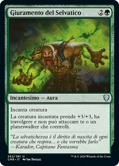 ![]() Variations— Parts—  | Voto di SelvatichezzaIncanta creatura La creatura incantata prende +3/+3, ha travolgere e non può attaccare te o un planeswalker che controlli.