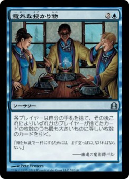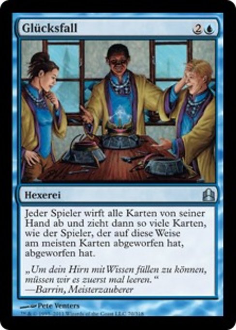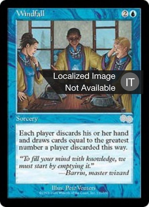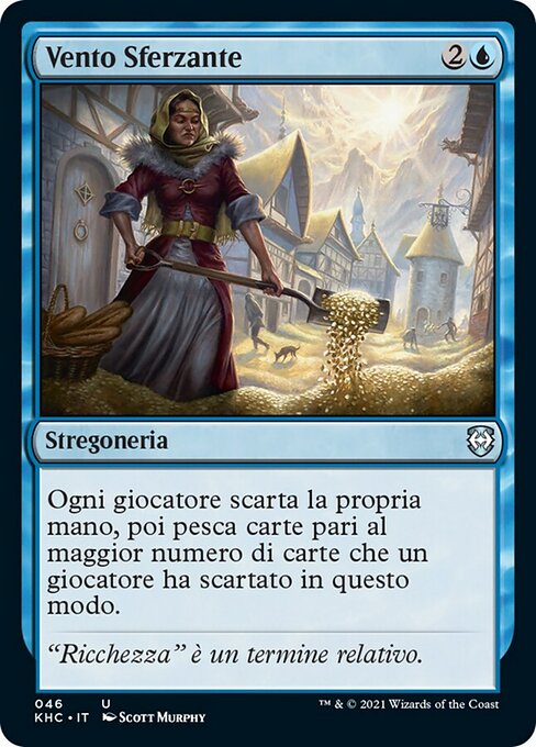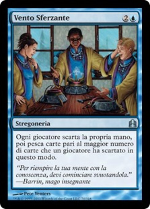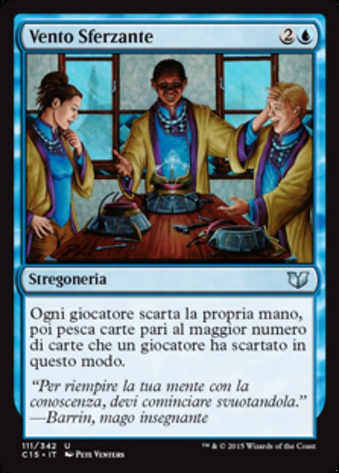 ![]() Variations— Parts— | Vento SferzanteOgni giocatore scarta la propria mano, poi pesca carte pari al maggior numero di carte che un giocatore ha scartato in questo modo.