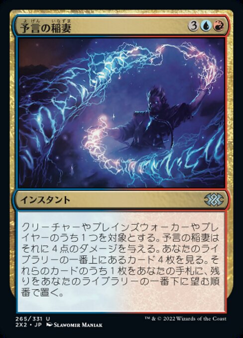 |  Variations— Parts— | 予言の稲妻クリーチャー1体かプレイヤー1人を対象とする。予言の稲妻はそれに4点のダメージを与える。 あなたのライブラリーの一番上から4枚のカードを見る。 そのうち1枚をあなたの手札に加え、残りをあなたのライブラリーの一番下に望む順番で置く。