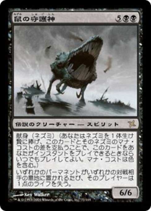 ![]() Variations— Parts— | 鼠の守護神6 / 6 献身(ネズミ) (あなたはネズミを1体生け贄に捧げ、このカードとそのネズミのマナ・コストの差を支払うことで、このカードをあなたがインスタントを唱えられるときならいつでも唱えててよい。 マナ・コストは色を含む。) パーマネントが1ついずれかの対戦相手の墓地に置かれるたび、そのプレイヤーは1点のライフを失う。