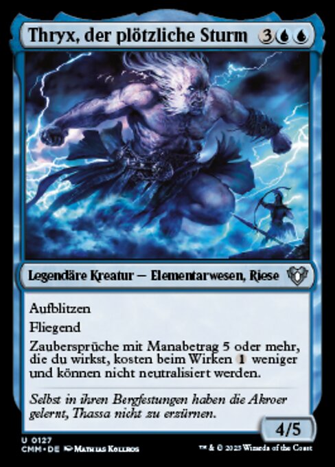 |  Variations— Parts— | Thryx, the Sudden Storm4 / 5 Flash (You may cast this spell any time you could cast an instant.) Flying Spells you cast with mana value 5 or greater cost