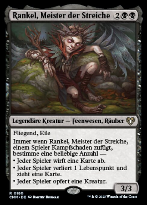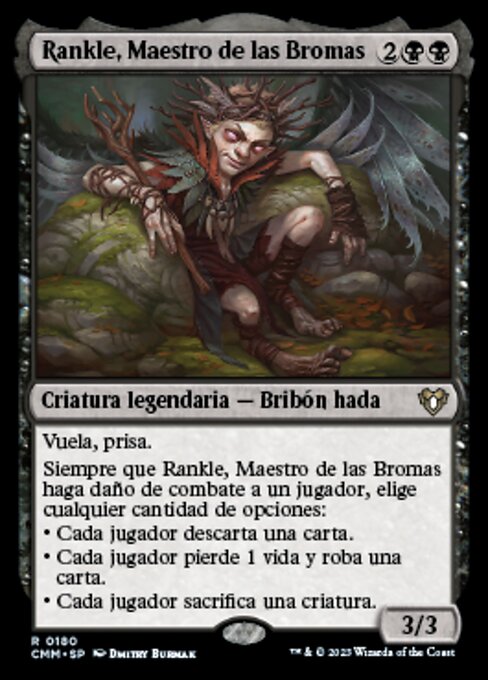 |  Variations : 1Parts— | Rankle, Master of Pranks3 / 3 Flying, haste Whenever Rankle deals combat damage to a player, choose any number — • Each player discards a card. • Each player loses 1 life and draws a card. • Each player sacrifices a creature of their choice.