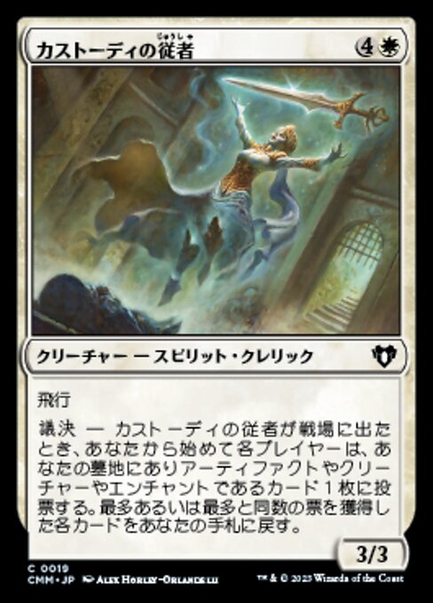![]() Variations— Parts— | Custodi Squire3 / 3 Flying Will of the council — When this creature enters, starting with you, each player votes for an artifact, creature, or enchantment card in your graveyard. Return each card with the most votes or tied for most votes to your hand.