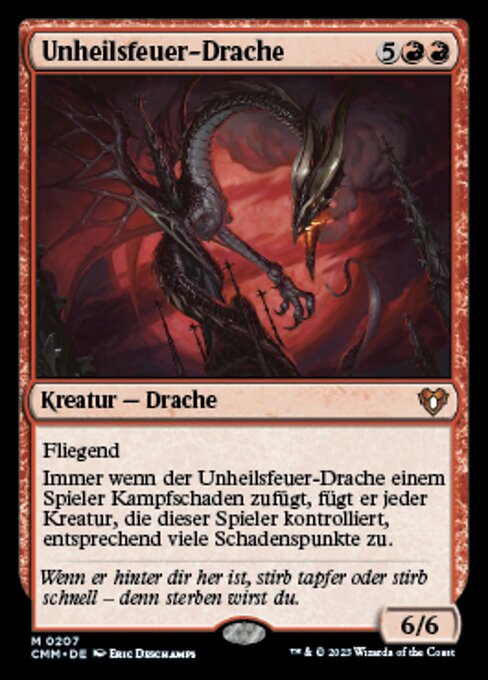 |  Variations : 2Parts— | Balefire Dragon6 / 6 Flying Whenever this creature deals combat damage to a player, it deals that much damage to each creature that player controls.