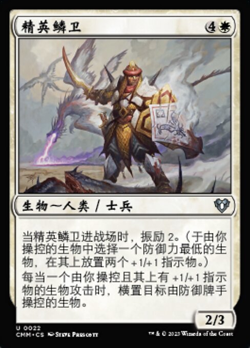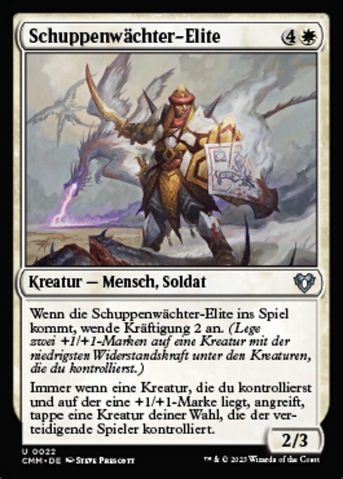 ![]() Variations— Parts— | Elite Scaleguard2 / 3 When this creature enters, bolster 2. (Choose a creature with the least toughness among creatures you control and put two +1/+1 counters on it.) Whenever a creature you control with a +1/+1 counter on it attacks, tap target creature defending player controls.