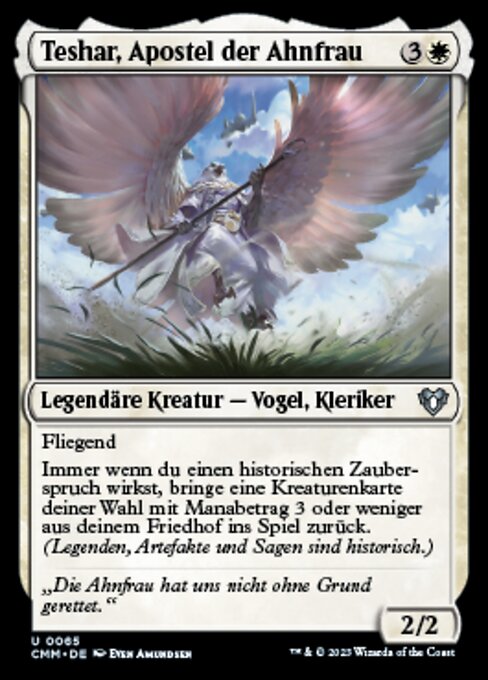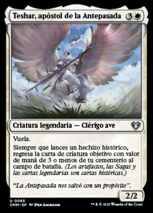 |  Variations— Parts— | Teshar, Ancestor's Apostle2 / 2 Flying Whenever you cast a historic spell, return target creature card with mana value 3 or less from your graveyard to the battlefield. (Artifacts, legendaries, and Sagas are historic.)