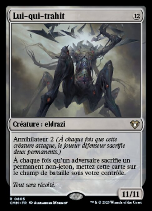 |  Variations— Parts— | It That Betrays11 / 11 Annihilator 2 (Whenever this creature attacks, defending player sacrifices two permanents of their choice.) Whenever an opponent sacrifices a nontoken permanent, put that card onto the battlefield under your control.