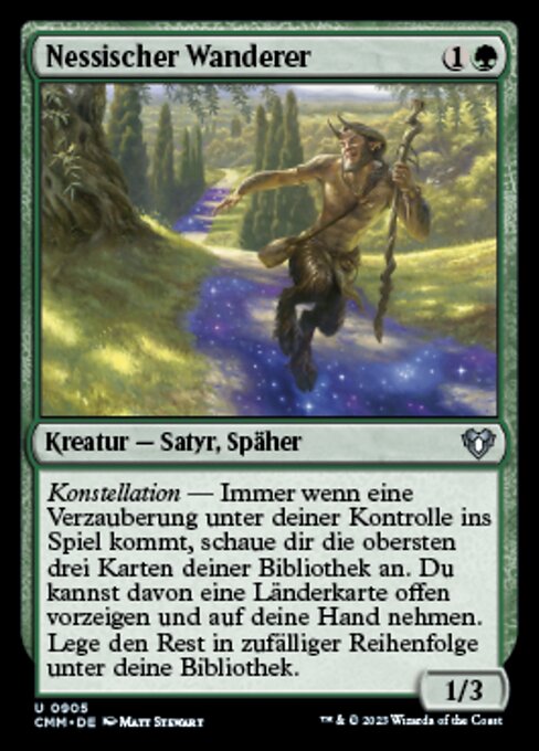 |  Variations— Parts— | Nessian Wanderer1 / 3 Constellation — Whenever an enchantment you control enters, look at the top three cards of your library. You may reveal a land card from among them and put that card into your hand. Put the rest on the bottom of your library in a random order.