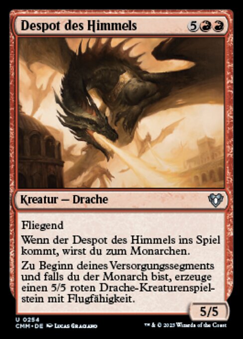 |  Variations— Parts— | Déspota del horizonte5 / 5 Vuela. Cuando el Déspota del horizonte entre al campo de batalla, te conviertes en el monarca. Al comienzo de tu mantenimiento, si eres el monarca, crea una ficha de criatura Dragón roja 5/5 con la habilidad de volar.