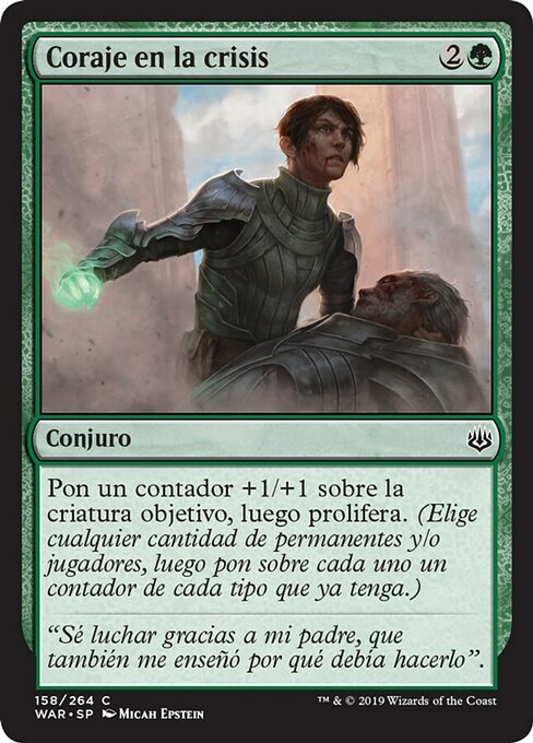 ![]() Variations— Parts— | Coraje en la crisisPon un contador +1/+1 sobre la criatura objetivo, luego prolifera. (Elige cualquier cantidad de permanentes y/o jugadores, luego pon sobre cada uno un contador de cada tipo que ya tenga.)