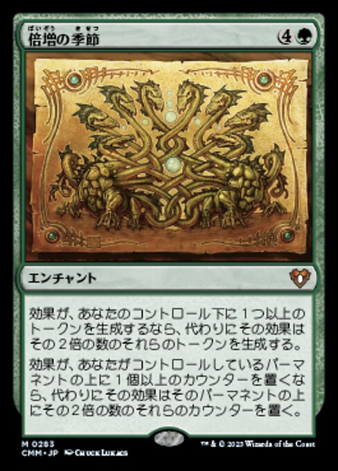 ![]() Variations— Parts—  | Temporada duplicadoraSi un efecto fuera a crear una o más fichas bajo tu control, en vez de eso, crea el doble de esas fichas. Si un efecto fuera a poner uno o más contadores sobre un permanente que controlas, en vez de eso, pone el doble de esa cantidad de contadores sobre ese permanente.