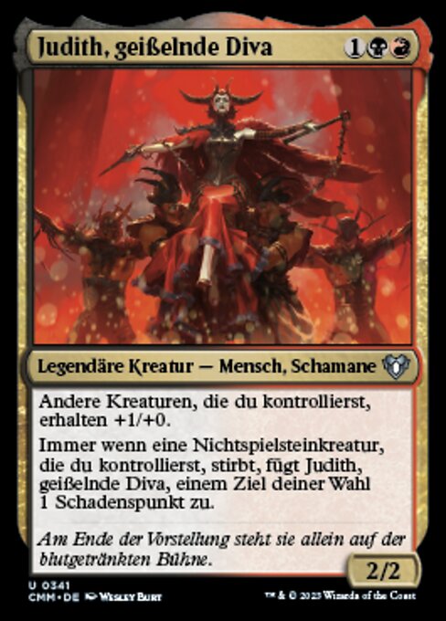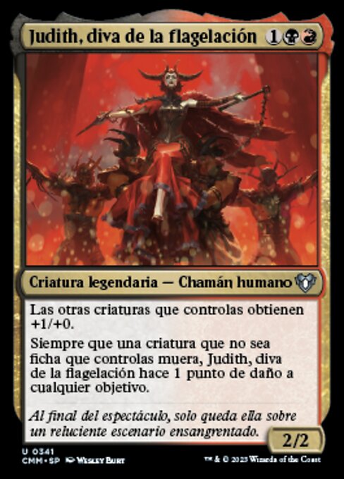 |  Variations— Parts— | Judith, diva de la flagelación2 / 2 Las otras criaturas que controlas obtienen +1/+0. Siempre que una criatura que no sea ficha que controlas muera, Judith, diva de la flagelación hace 1 punto de daño a cualquier objetivo.