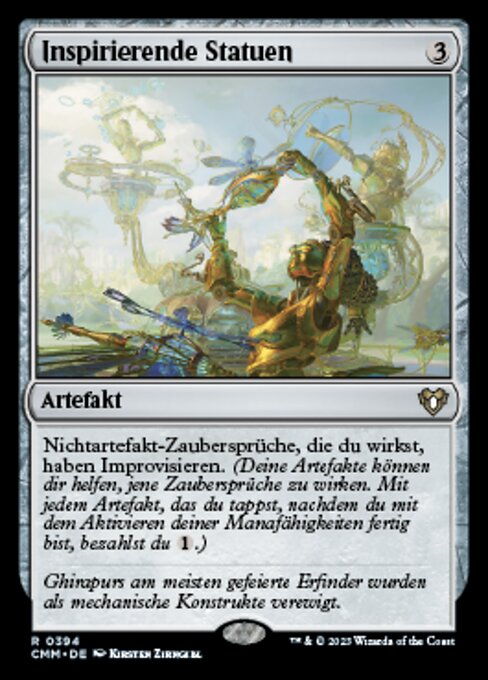 ![]() Variations— Parts— | Estatuas inspiradorasLos hechizos que no sean de artefacto que lances tienen la habilidad de improvisar. (Tus artefactos pueden ayudar a lanzar esos hechizos. Cada artefacto que gires una vez que termines de activar habilidades de maná paga