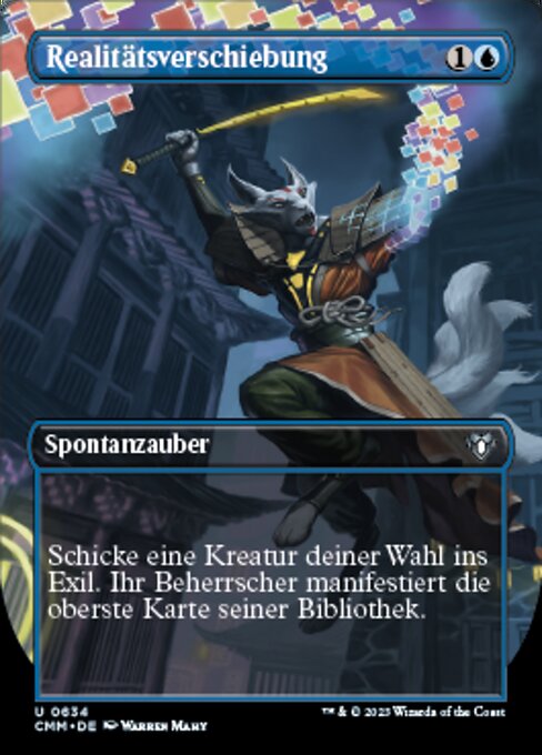 |  Variations : 1Parts— | Cambio de realidadExilia la criatura objetivo. Su controlador manifiesta la primera carta de su biblioteca.