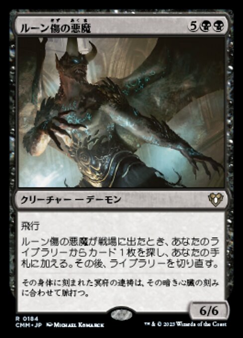 |  Variations : 1Parts— | ルーン傷の悪魔6 / 6 飛行 ルーン傷の悪魔が戦場に出たとき、あなたのライブラリーからカード1枚を探し、あなたの手札に加える。その後、ライブラリーを切り直す。