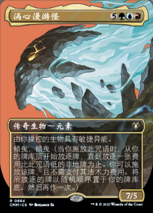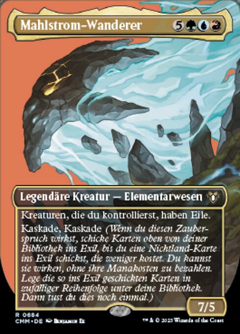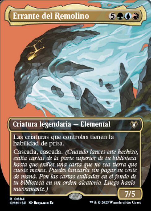![]() Variations : 2Parts— | 大渦の放浪者7 / 5 あなたがコントロールしているすべてのクリーチャーは速攻を持つ。 続唱、続唱(あなたがこの呪文を唱えたとき、コストがこれより低く土地でないカード1枚が追放されるまで、あなたのライブラリーの一番上から1枚ずつ追放していく。それをマナ・コストを支払うことなく唱えてもよい。それらの追放されているカードをあなたのライブラリーの一番下に無作為の順番で置く。その後、それをもう一度行う。)