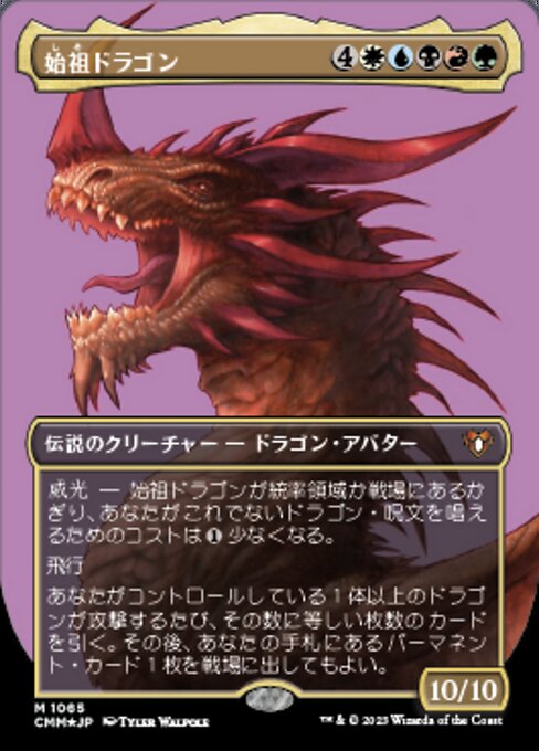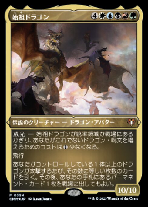 ![]() Variations : 3Parts— | 始祖ドラゴン10 / 10 威光 ― 始祖ドラゴンが統率領域か戦場にあるかぎり、あなたがこれでないドラゴン・呪文を唱えるためのコストは 飛行 あなたがコントロールしている1体以上のドラゴンが攻撃するたび、その数に等しい枚数のカードを引く。その後、あなたの手札にあるパーマネント・カード1枚を戦場に出してもよい。