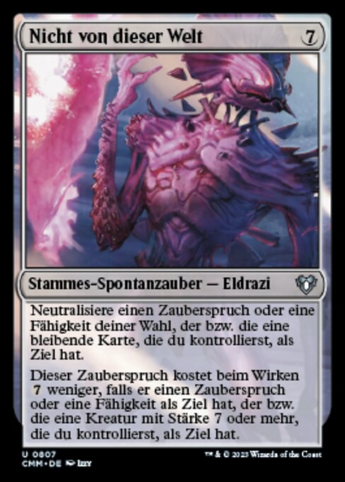 ![]() Variations— Parts— | この世界にあらず呪文や能力のうち、あなたがコントロールしているパーマネント1つを対象としている1つを対象とする。それを打ち消す。 これが、呪文や能力のうちあなたがコントロールしていてパワーが7以上であるクリーチャー1体を対象としている1つを対象としているなら、この呪文を唱えるためのコストは