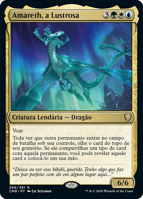 ![]() Variations : 1Parts— | Amareth, the Lustrous6 / 6 Flying Whenever another permanent you control enters, look at the top card of your library. If it shares a card type with that permanent, you may reveal that card and put it into your hand.