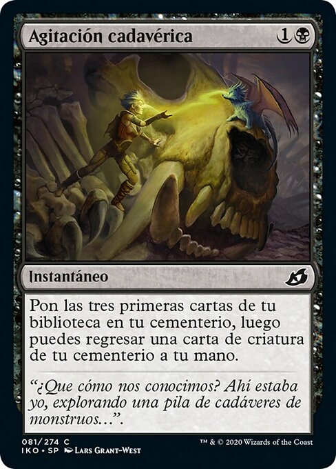 ![]() Variations— Parts— | Agitación cadavéricaMuele tres cartas, luego puedes regresar una carta de criatura de tu cementerio a tu mano. (Para moler una carta, pon la primera carta de tu biblioteca en tu cementerio.)