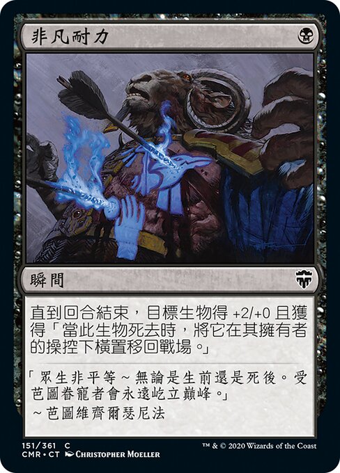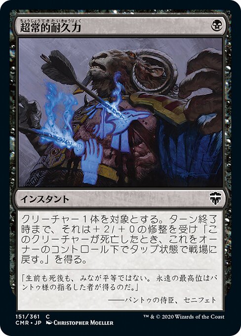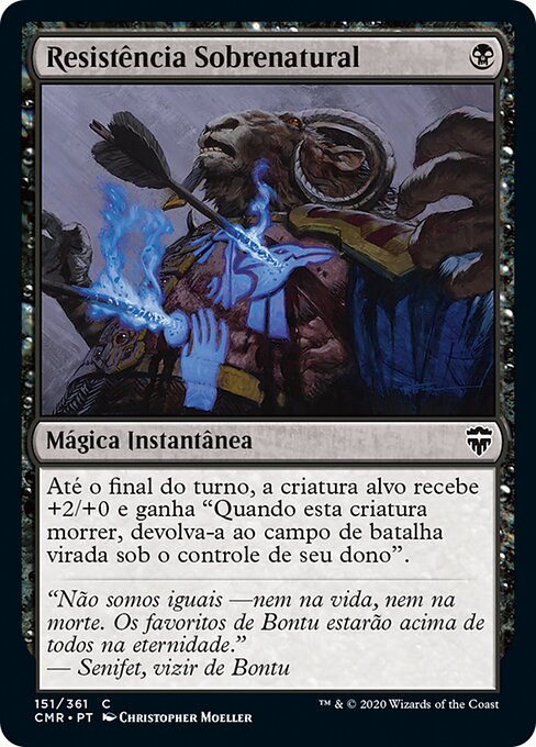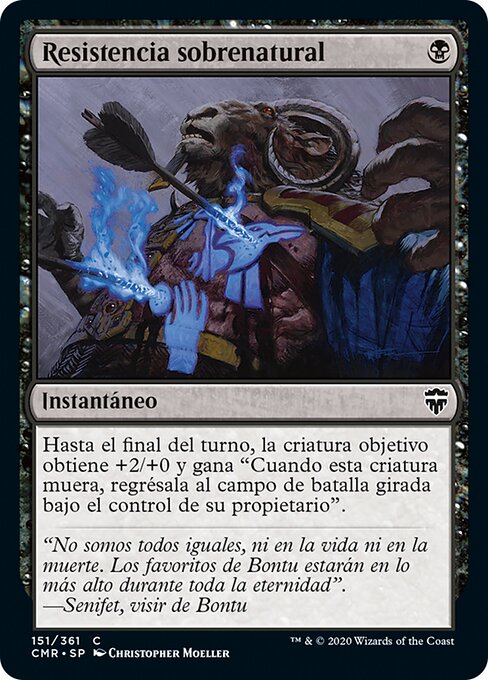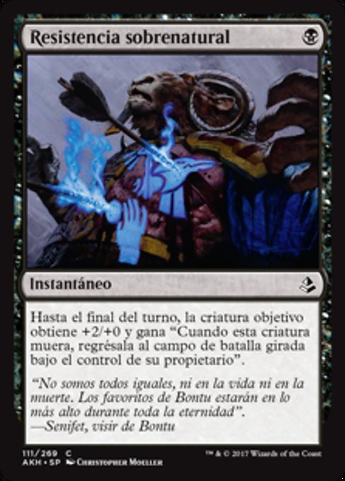 |  Variations— Parts— | Resistencia sobrenaturalHasta el final del turno, la criatura objetivo obtiene +2/+0 y gana "Cuando esta criatura muera, regrésala al campo de batalla girada bajo el control de su propietario".