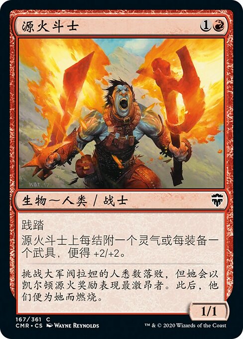 |  Variations— Parts— | Campeón de la Llama1 / 1 Arrolla. El Campeón de la Llama obtiene +2/+2 por cada Aura y Equipo anexados a él.
