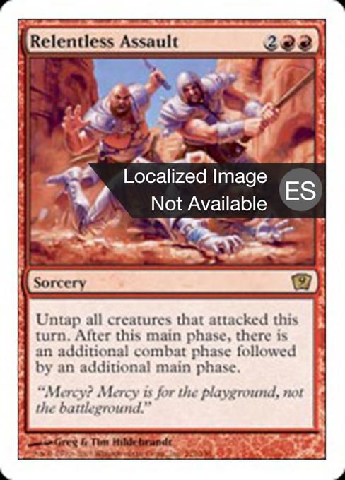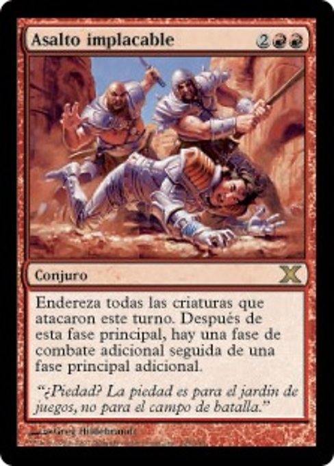 |  Variations— Parts— | Asalto implacableEndereza todas las criaturas que atacaron este turno. Después de esta fase principal, hay una fase de combate adicional seguida de una fase principal adicional.