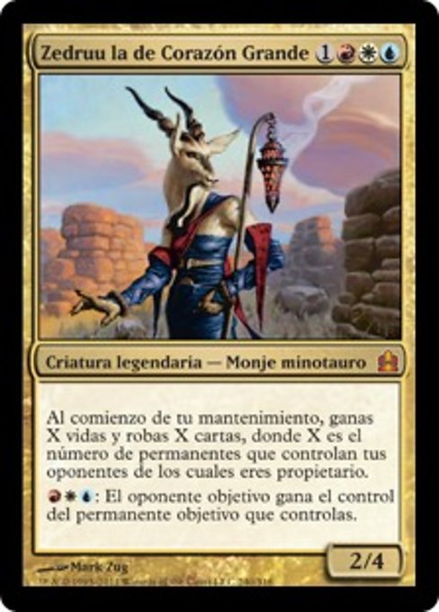 ![]() Variations— Parts— | Zedruu la de Corazón Grande2 / 4 Al comienzo de tu mantenimiento, ganas X vidas y robas X cartas, donde X es la cantidad de permanentes que controlan tus oponentes de los cuales eres propietario.