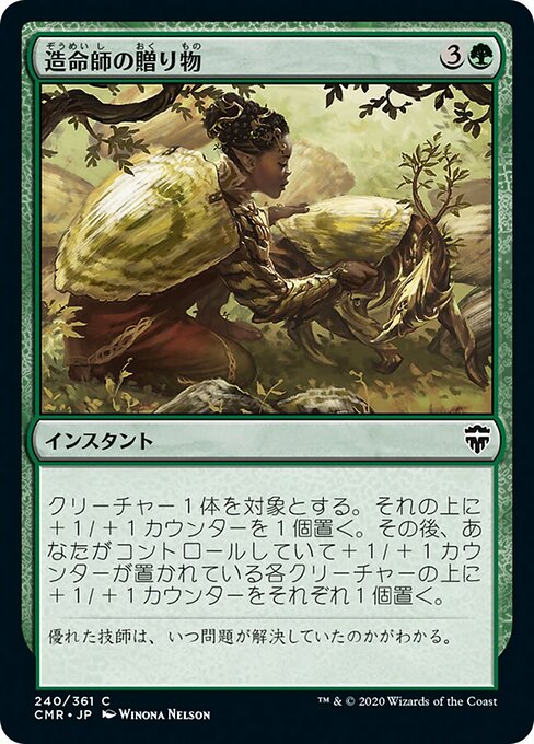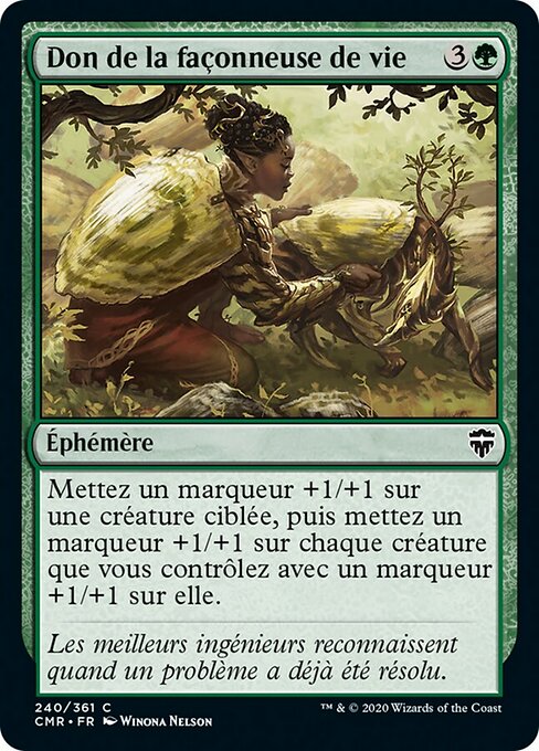 ![]() Variations— Parts— | Don de la façonneuse de vieMettez un marqueur +1/+1 sur une créature ciblée, puis mettez un marqueur +1/+1 sur chaque créature que vous contrôlez avec un marqueur +1/+1 sur elle.