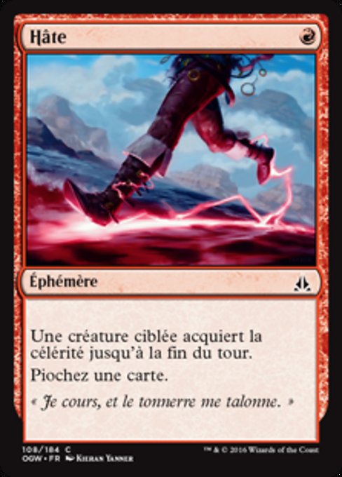 ![]() Variations— Parts— | HâteUne créature ciblée acquiert la célérité jusqu'à la fin du tour. Piochez une carte.