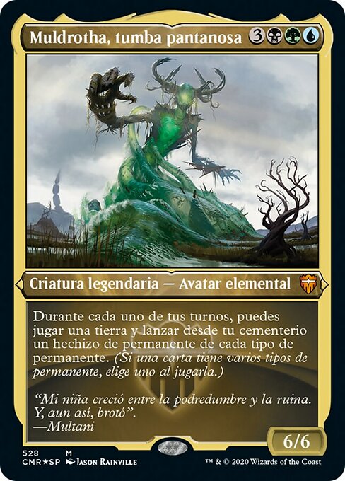 |  Variations— Parts— | Muldrotha, la marée funéraire6 / 6 Pendant chacun de vos tours, vous pouvez jouer un terrain et lancer un sort de permanent de chaque type de permanent depuis votre cimetière. (Si une carte a plusieurs types de permanent, choisissez-en un au moment où vous la jouez.)