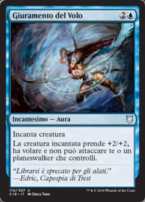 ![]() Variations— Parts—  | Giuramento del VoloIncanta creatura La creatura incantata prende +2/+2, ha volare e non può attaccare te o un planeswalker che controlli.