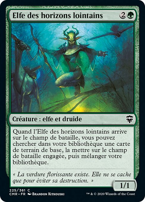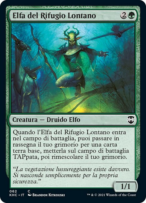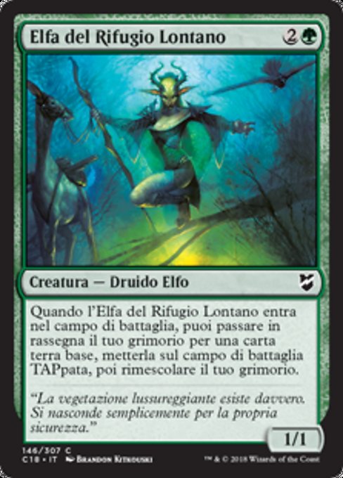 |  Variations— Parts— | Elfa del Rifugio Lontano1 / 1 Quando l'Elfa del Rifugio Lontano entra nel campo di battaglia, puoi passare in rassegna il tuo grimorio per una carta terra base, metterla sul campo di battaglia TAPpata, poi rimescolare il tuo grimorio.