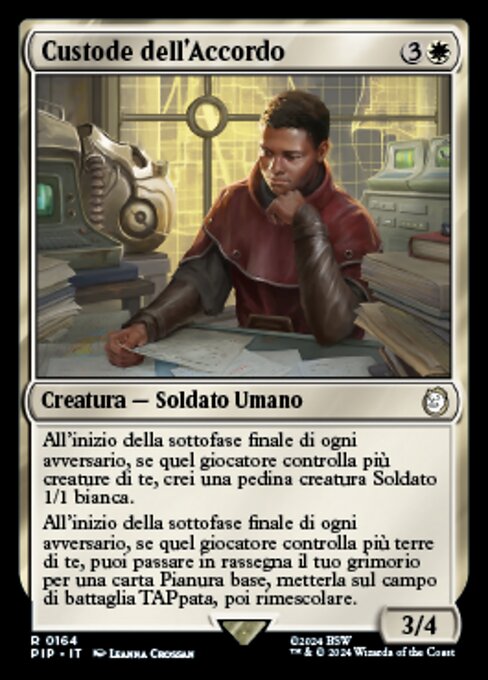 ![]() Variations— Parts— | Custode dell'Accordo3 / 4 All'inizio della sottofase finale di ogni avversario, se quel giocatore controlla più creature di te, crea una pedina creatura Soldato 1/1 bianca. All'inizio della sottofase finale di ogni avversario, se quel giocatore controlla più terre di te, puoi passare in rassegna il tuo grimorio per una carta Pianura base, metterla sul campo di battaglia TAPpata, poi rimescolare il tuo grimorio.