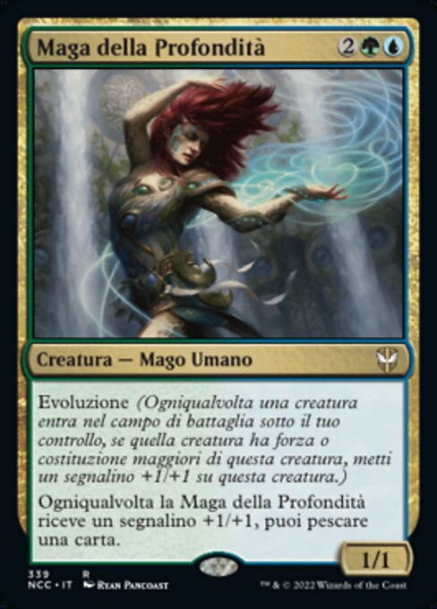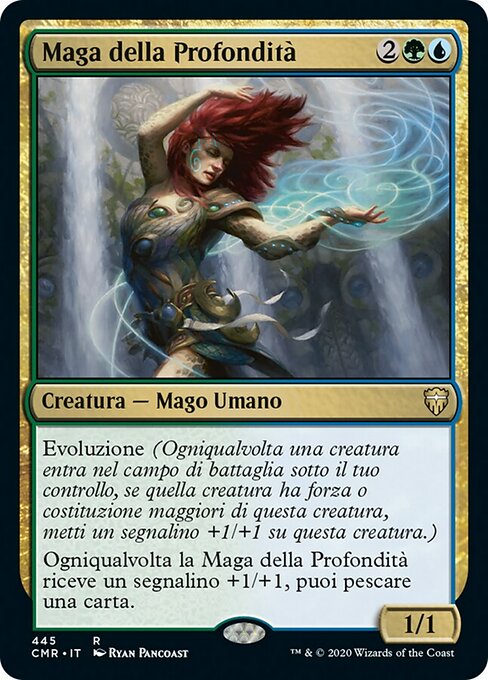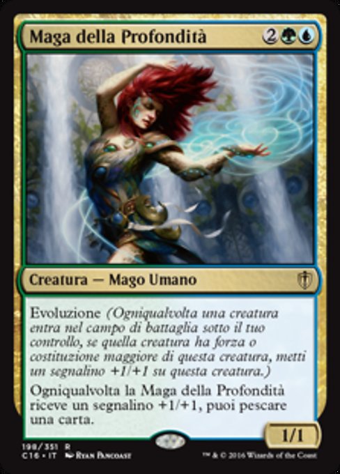 |  Variations— Parts— | Maga della Profondità1 / 1 Evoluzione (Ogniqualvolta una creatura entra nel campo di battaglia sotto il tuo controllo, se quella creatura ha forza o costituzione maggiori di questa creatura, metti un segnalino +1/+1 su questa creatura.) Ogniqualvolta la Maga della Profondità riceve un segnalino +1/+1, puoi pescare una carta.