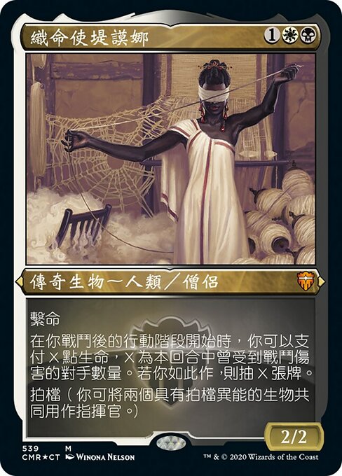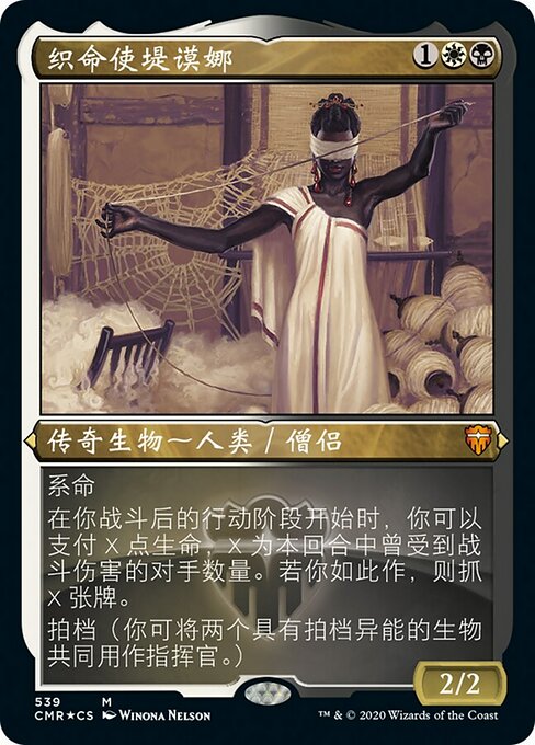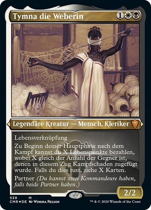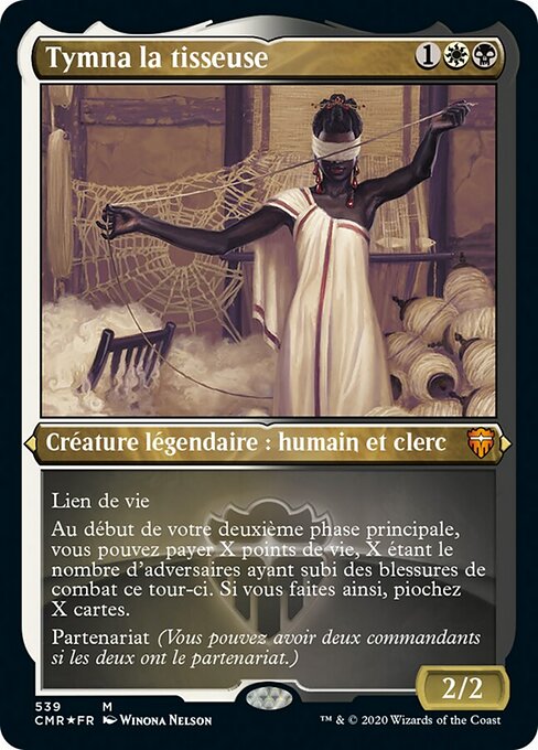 ![]() Variations— Parts— | Tymna, la Tessitrice2 / 2 Legame vitale All'inizio della tua fase principale post-combattimento, puoi pagare X punti vita, dove X è il numero di avversari a cui è stato inflitto danno da combattimento in questo turno. Se lo fai, pesca X carte. Partner (Puoi avere due comandanti se entrambi hanno partner.)